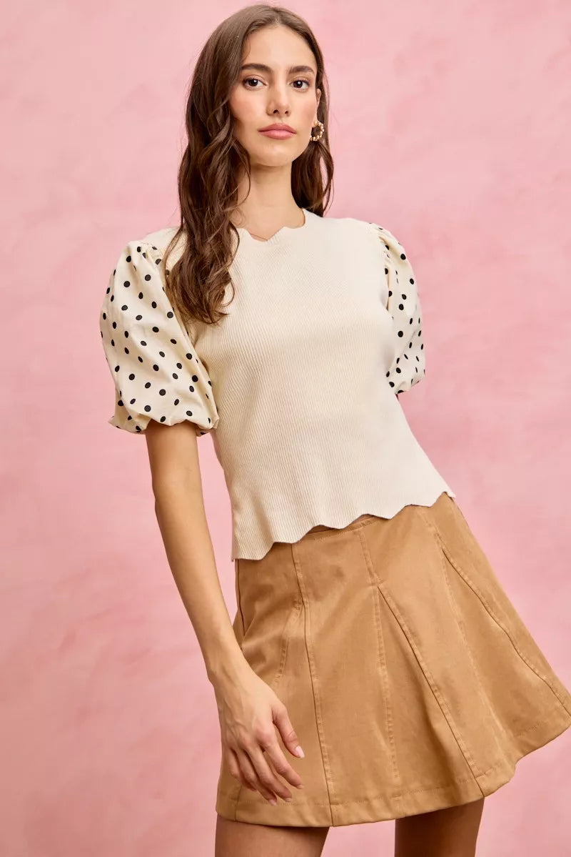 SO ME Polka Dot Contrast Woven Ballon Sleeve Blouse
