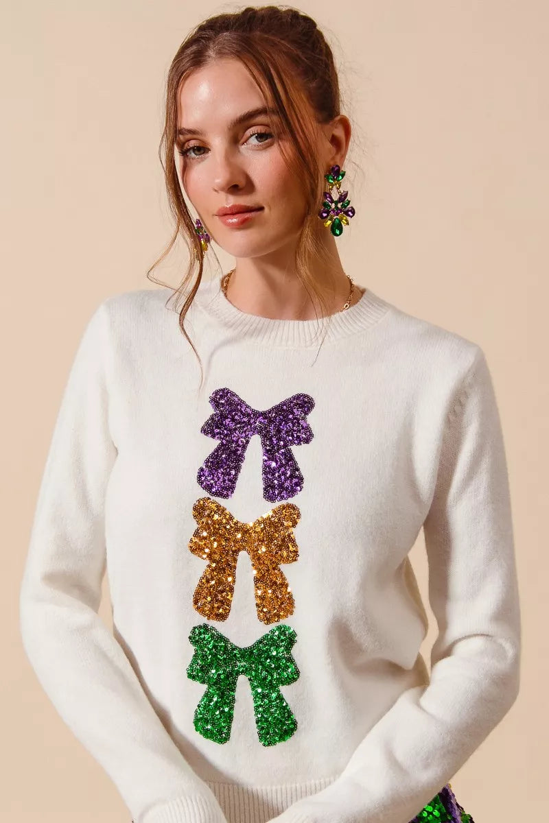 A Mardi Gras sequins bow ribbon embellished sweater is a festive and eye-catching piece featuring sequins, bows, and ribbon details inspired by the vibrant colors and celebrations of Mardi Gras. It is perfect for adding some fun and flair to your outfit during the festive season or themed events.