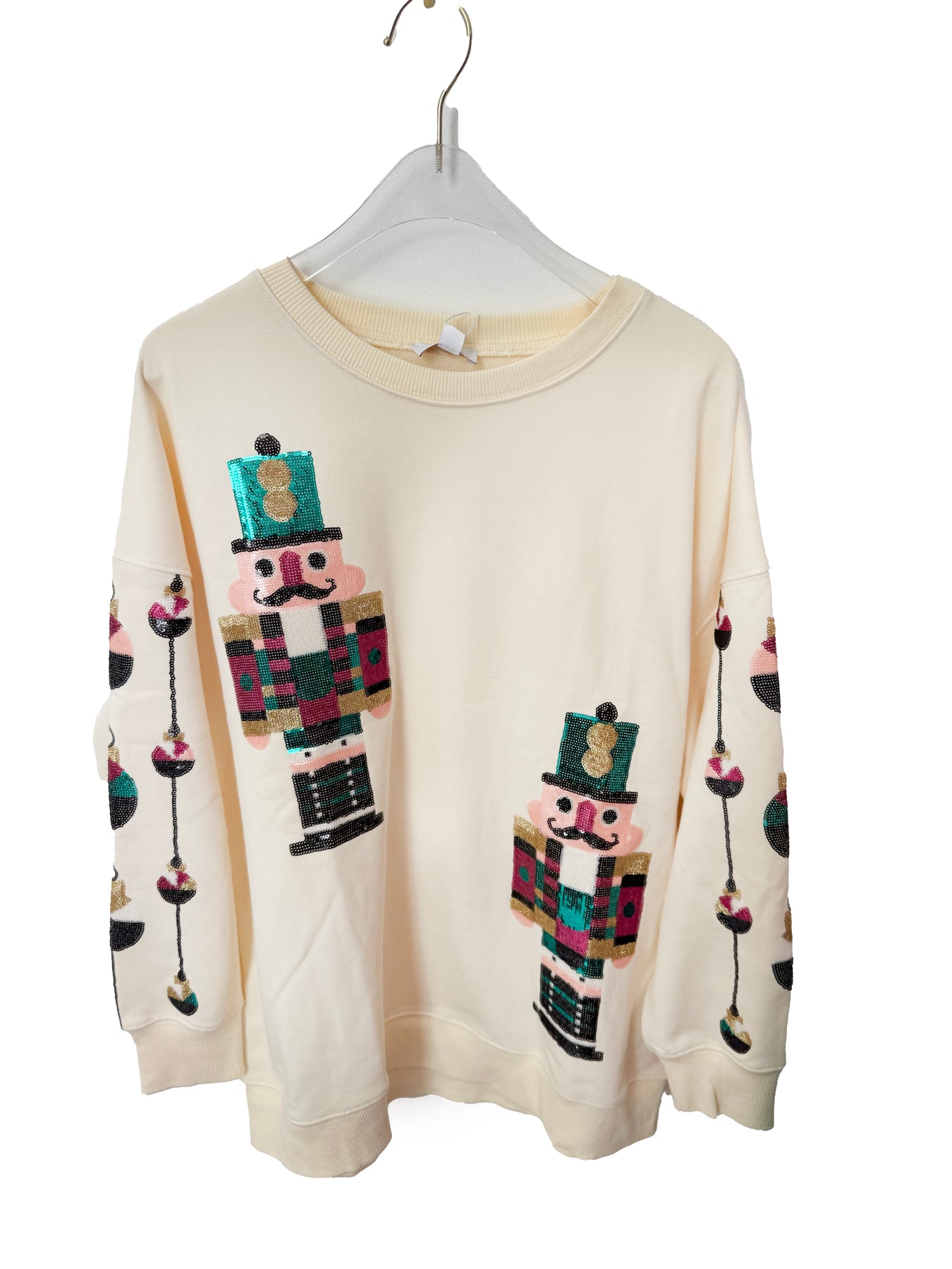 * Relaxed fit for an easy, festive look * Ribbed cuffs and hem * Fit: Runs true to size, model is wearing a S/M. * Approximate Measurements: * S/M - Bust: 48" Length: 28" * Large/1X - Bust: 52" Length: 30" * 2X/3X - Bust: 56" Length: 31" * 60% Cotton 40% Polyester